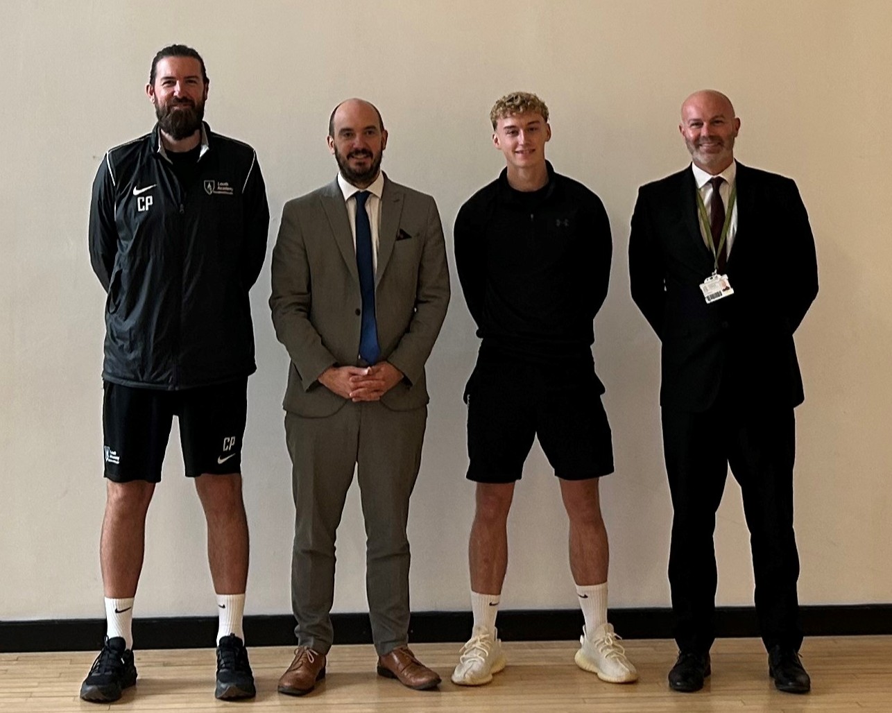 The 18-year-old professional is welcomed back to Louth Academy by Mr Hermiston (second left), Mr Blackbourn (right) and Curriculum Leader of PE Mr Prendergast.