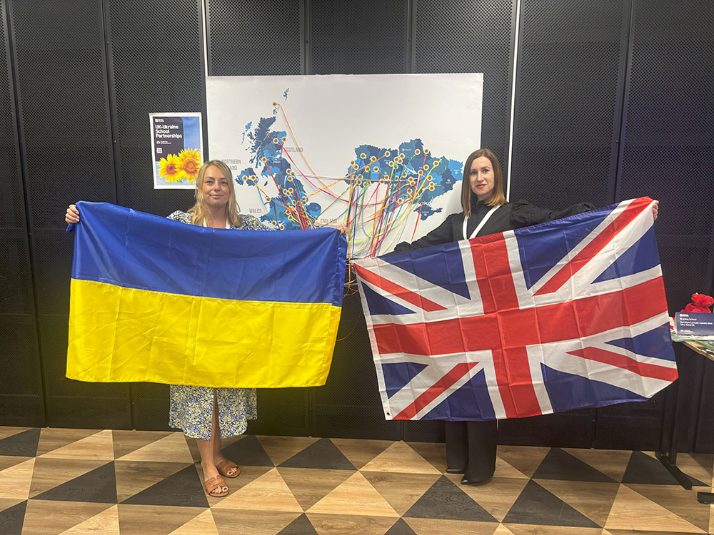 In front of a map which linked the schools by ribbon, with Ms Barker holding the Ukrainian flag and Ms Vozniuk the UK’s.